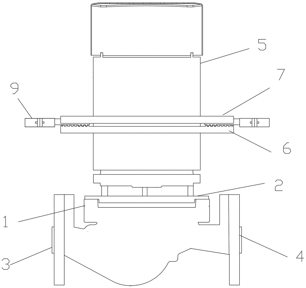 參照?qǐng)D1-圖2所示,本實(shí)施例所述一種循環(huán)管道泵,包括泵殼1、泵蓋2和電機(jī)5,所述泵殼1的左右兩側(cè)分別開設(shè)有進(jìn)水口3與出水口4且進(jìn)水口3的中心和出水口4的中心軸線均與水平線平行,所述泵殼1上方蓋合有泵蓋2,所述電機(jī)5呈豎直狀連接在泵殼1上方。所述電機(jī)5的外周壁上安裝有一個(gè)管道支撐組件,所述管道支撐組件包括沿軸向依次套設(shè)在電機(jī)5外的旋轉(zhuǎn)盤6、固定盤7,所述固定盤7與電機(jī)5固定連接,旋轉(zhuǎn)盤6與電機(jī)5之間軸向固定、周向可轉(zhuǎn)動(dòng)連接。結(jié)合圖4,所述固定盤7上沿徑向開設(shè)有不少于兩個(gè)滑槽701,所述滑槽701內(nèi)一一對(duì)應(yīng)滑移連接有滑塊8,所述滑塊8的外端設(shè)有用于固定管道的支撐環(huán)扣9,所述支撐環(huán)扣9包括可對(duì)合呈圓環(huán)的兩個(gè)半圓環(huán)體901,兩個(gè)半圓環(huán)901的一端鉸接,另一端通過螺釘固定連接,所述支撐環(huán)扣9的內(nèi)周面上設(shè)有橡膠墊(圖中未畫出)。本實(shí)施例中,所述滑塊8數(shù)量為兩個(gè)且兩個(gè)滑塊8位于同一直線上。