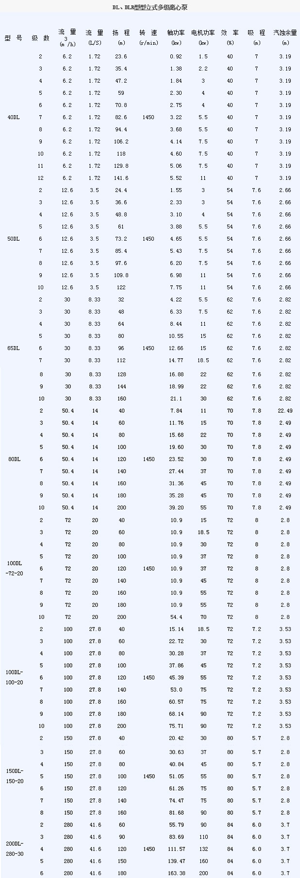 四、DL、DLR型型立式多級離心泵性能參數(shù):