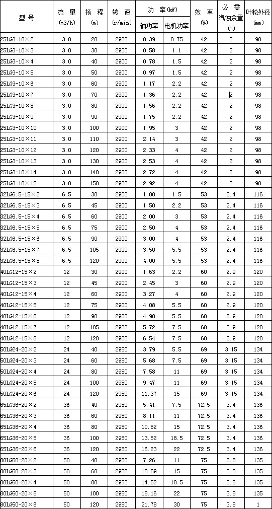 六、LG型高層建筑給水離心泵性能參數(shù):